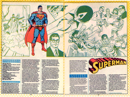 There were also instances that certain characters or groups were granted a two page spread, mostly to expand on the character's story, and also allowed the artist to give a bigger spread for artwork, as well as in the case of teams and such, to include all the members. Some of the most popular and famous characters of DC were given two page spreads. Here is one example: